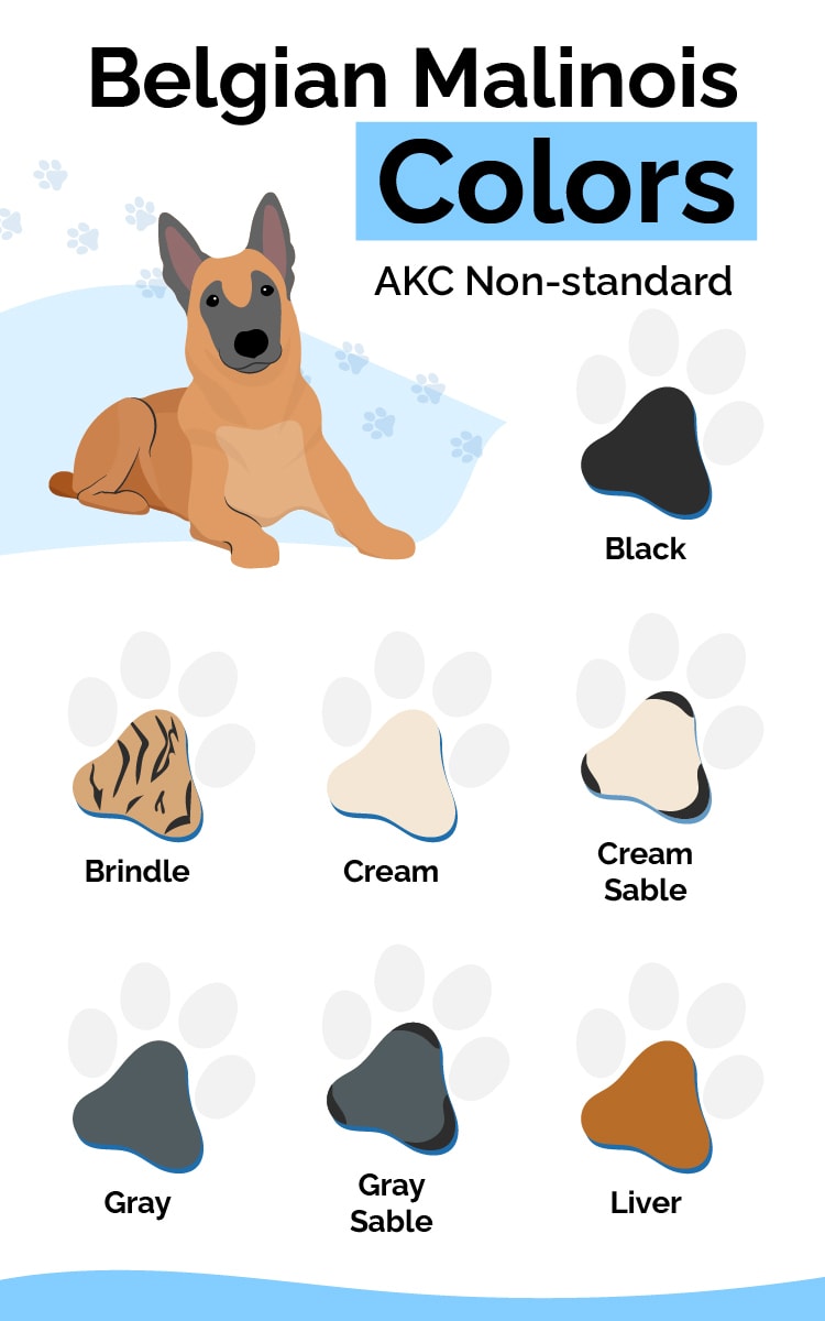 The AKC recognizes standard and non-standard coat colors and patterns for the Belgian Malinois. The standard coats conform to official club standards, while the non-standard colors fall outside of such standards. Dogs with non-standard coat colors and patterns may be enrolled in the AKC but are not permitted to compete in official competitions.