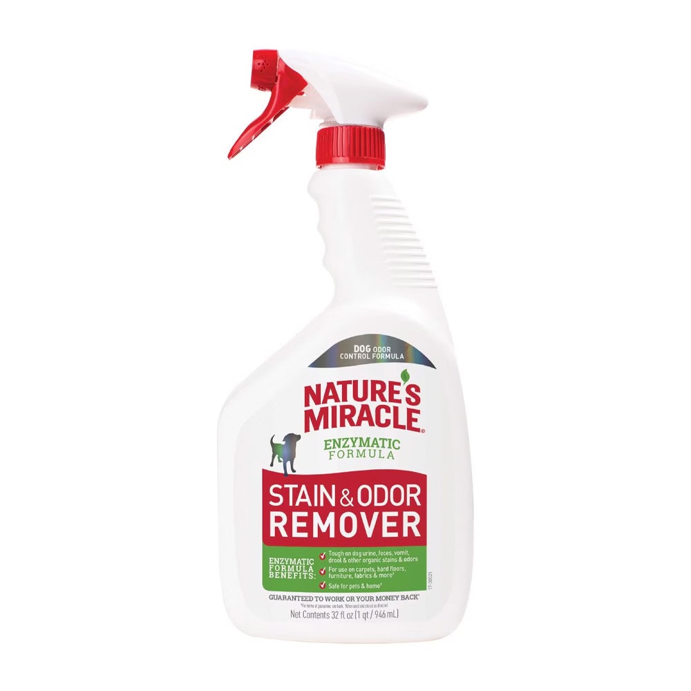 Nature’s Miracle Advanced Dog Stain & Odor Remover Spray is an enzymatic cleaner that comes in a spray bottle and includes surfactants that help lift the urine off the surface so that the enzymes can effectively destroy and consume the molecules responsible for the bad smell and staining created by dog urine.