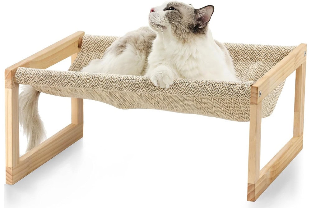 Made from stable pine wood and soft, breathable fabric, the large Cat Bed from FUKUMARU is a gorgeous, modern take on a cat bed. The bed is a breeze to assemble in only 3 steps, and it is just as easy to disassemble to store or wash. It can hold weights of up to 40 pounds, making it perfect for most felines.