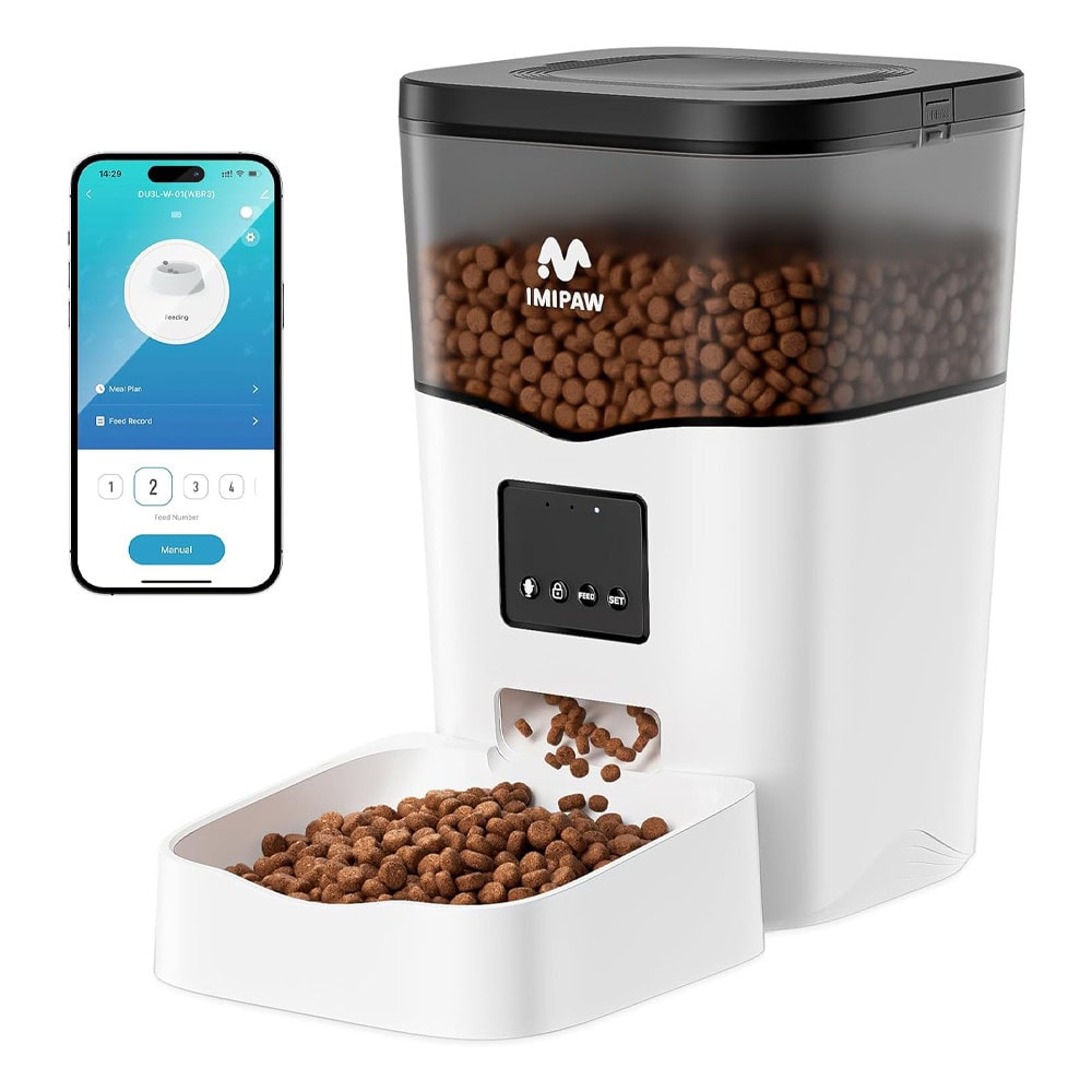 This automatic feeder from IMIPAW comes equipped with WiFi to help you program and monitor your cat’s feeding schedule. The feeder can also record up to 10 seconds of personalized sound for your feline, and automatically play it at mealtime to remind your cat that It’s time to eat, plus allows your pet to hear your company and strengthen the bond between you.