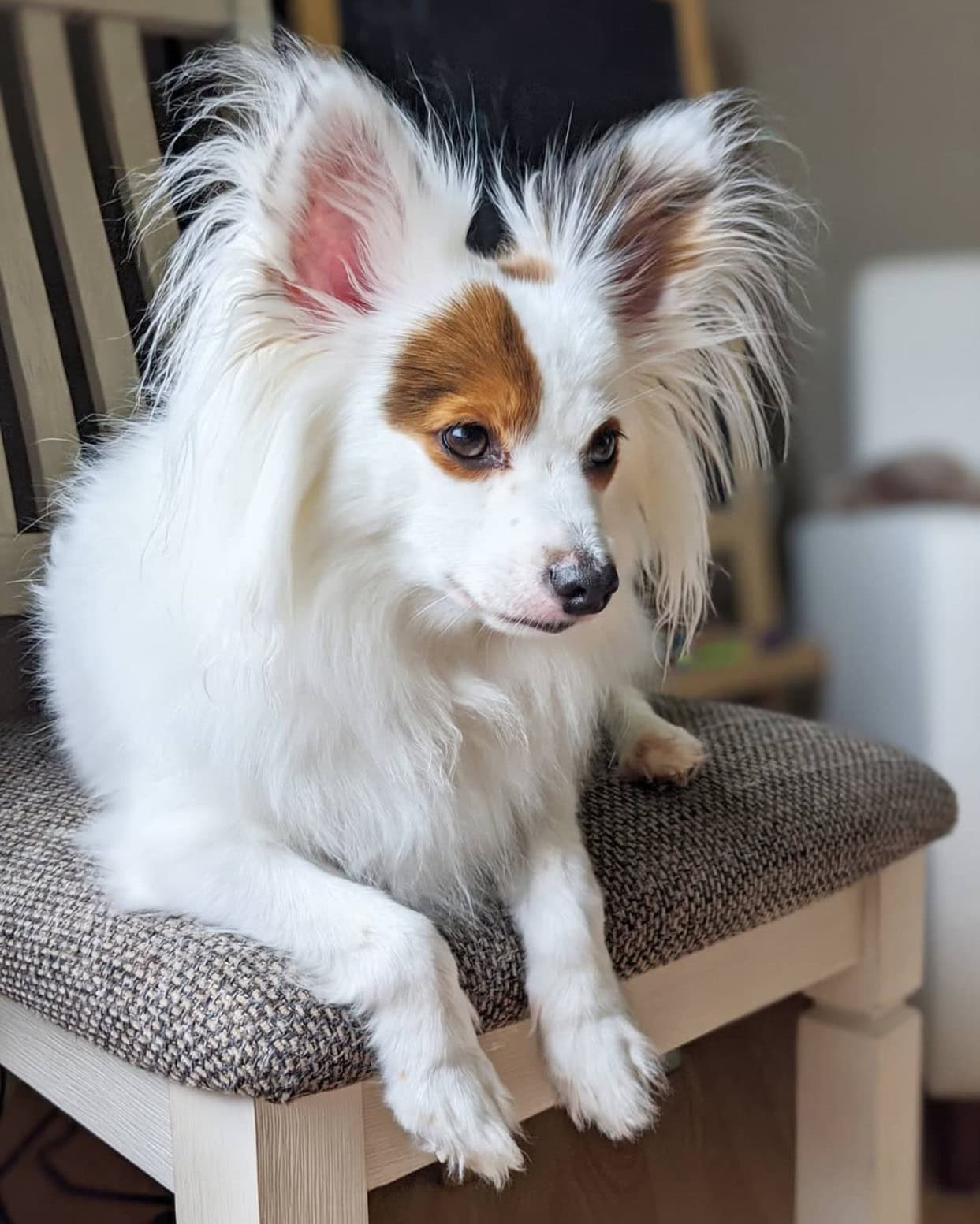 If your pup takes after the Papillon, he’ll have the large, hair-covered ears that are characteristic of the breed. You should clean them frequently and pull excess hair to ensure good air circulation for preventing ear infections. The name, Papillon, by the way, means butterfly in French. Also, trim your pup’s nails frequently, paying particular attention to his dewclaws.